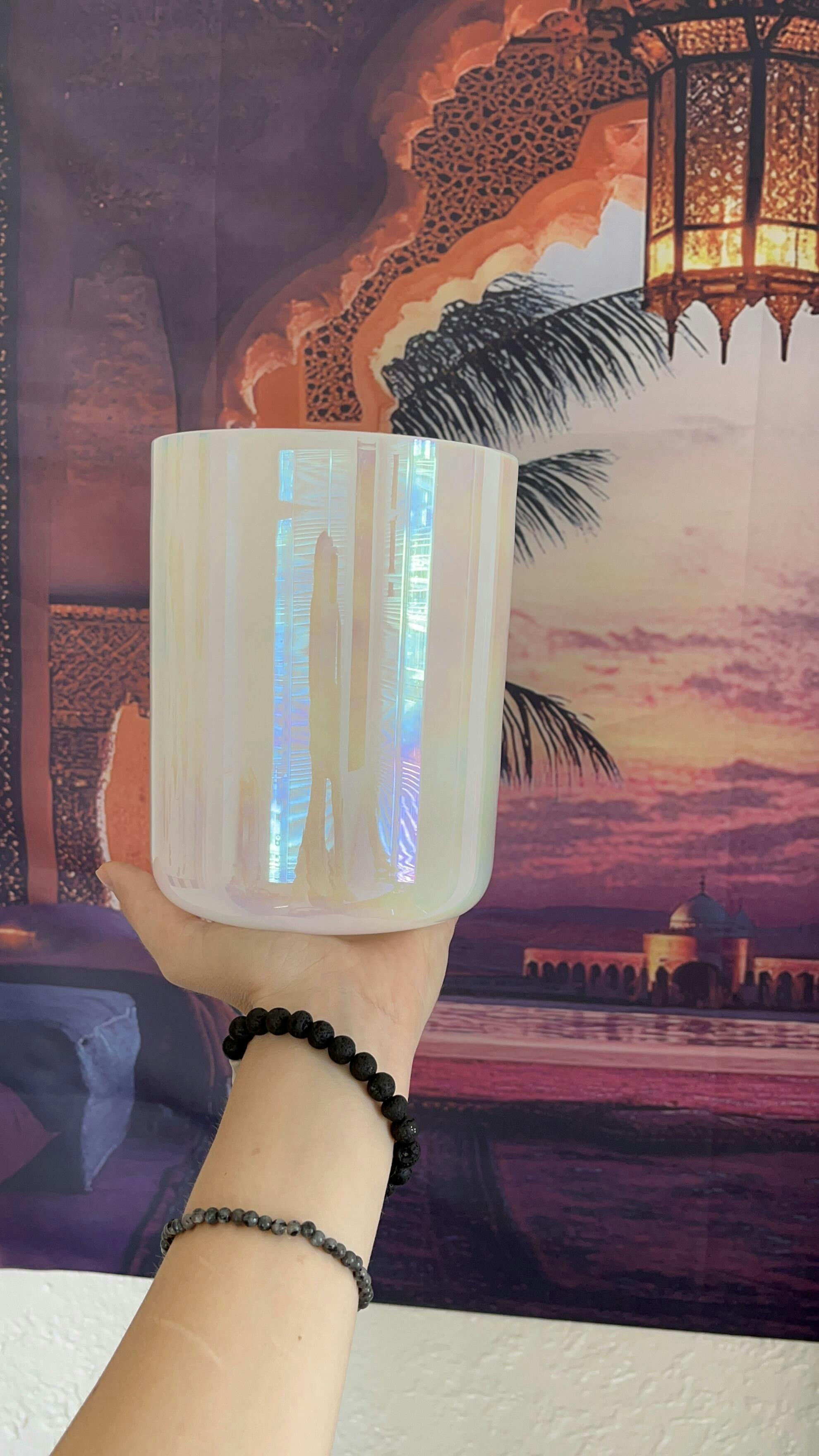 This stunning pearl white quartz crystal bowl is tuned to the frequency of the Soul Purpose Chakra - C note in the 5th octave.